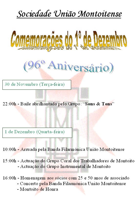 A SUM convida todos os seus sócios e amigos a assistir ao concerto de Natal no próximo sábado dia 18, a partir das 16h00m, abrilhantado pela Filarmónica da nossa terra e pelo novo grupo, também de Montoito "Júlio Franco Ensemble"